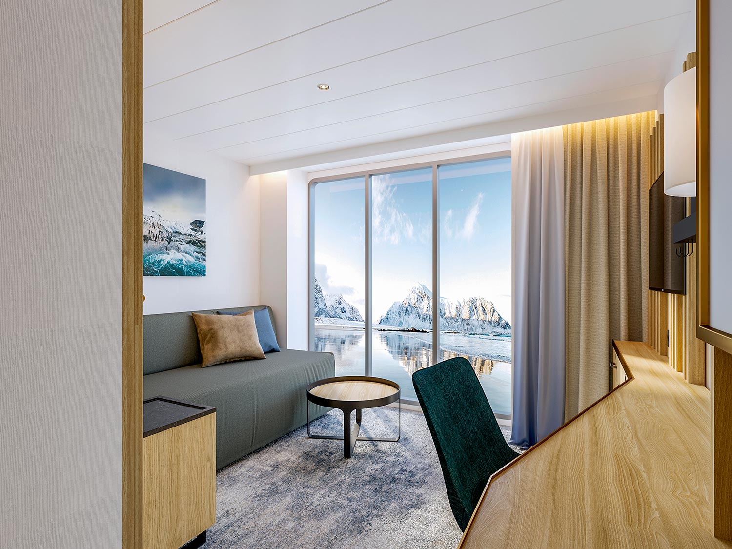 Wyposażenie : jedno podwójne lub dwa pojedyncze łóżka w prywatnej sypialni z garderobą, część wypoczynkowa z rozkładaną sofą i dodatkową garderobą w przedpokoju, prywatny balkon, biurko, lodówka, telewizor, prywatna łazienka z prysznicem, wanną i podgrzewaną podłogą oraz oddzielna toaleta.