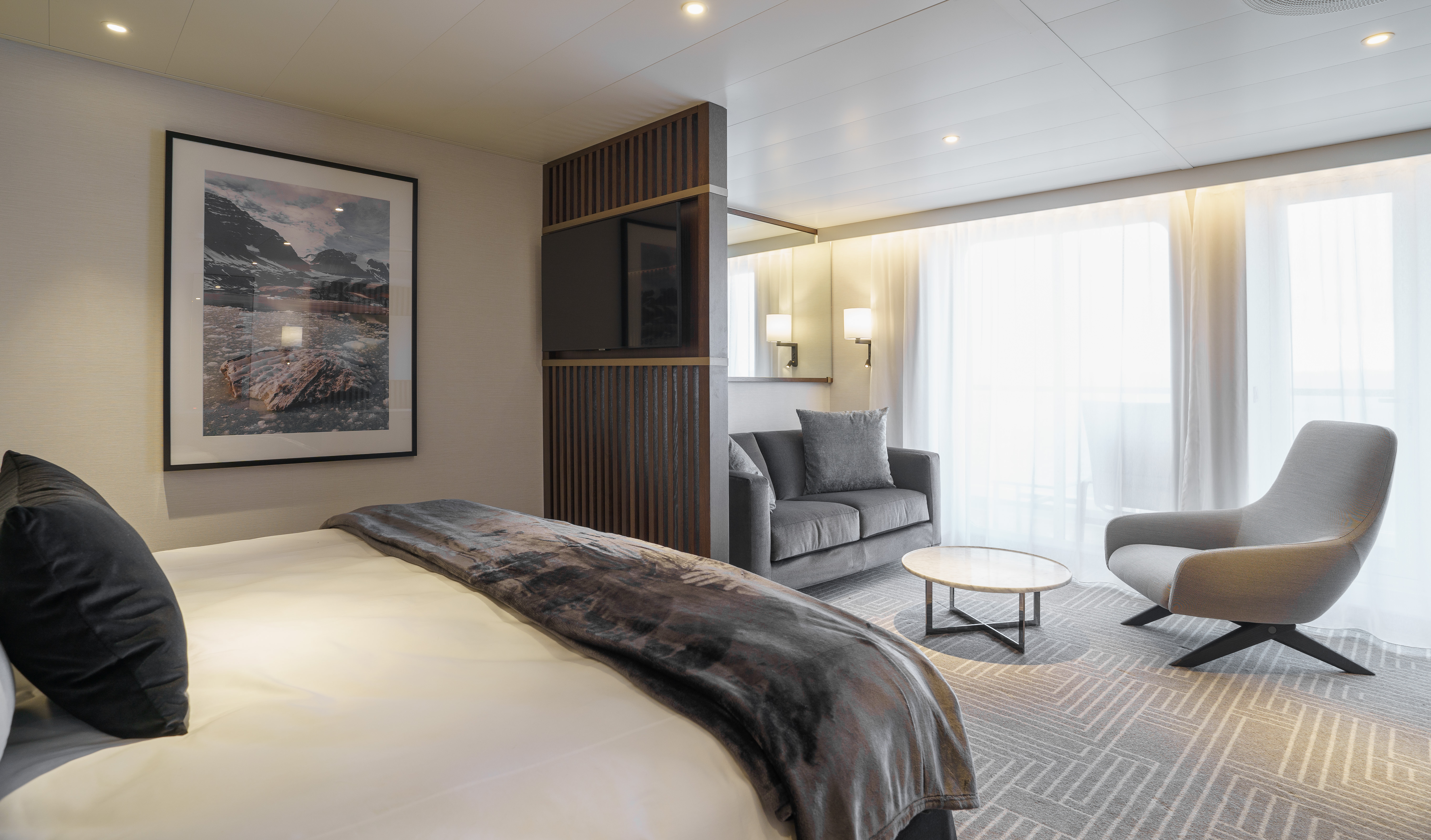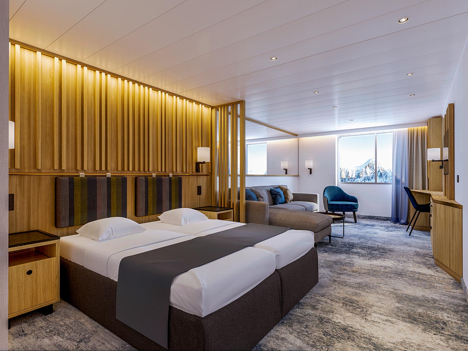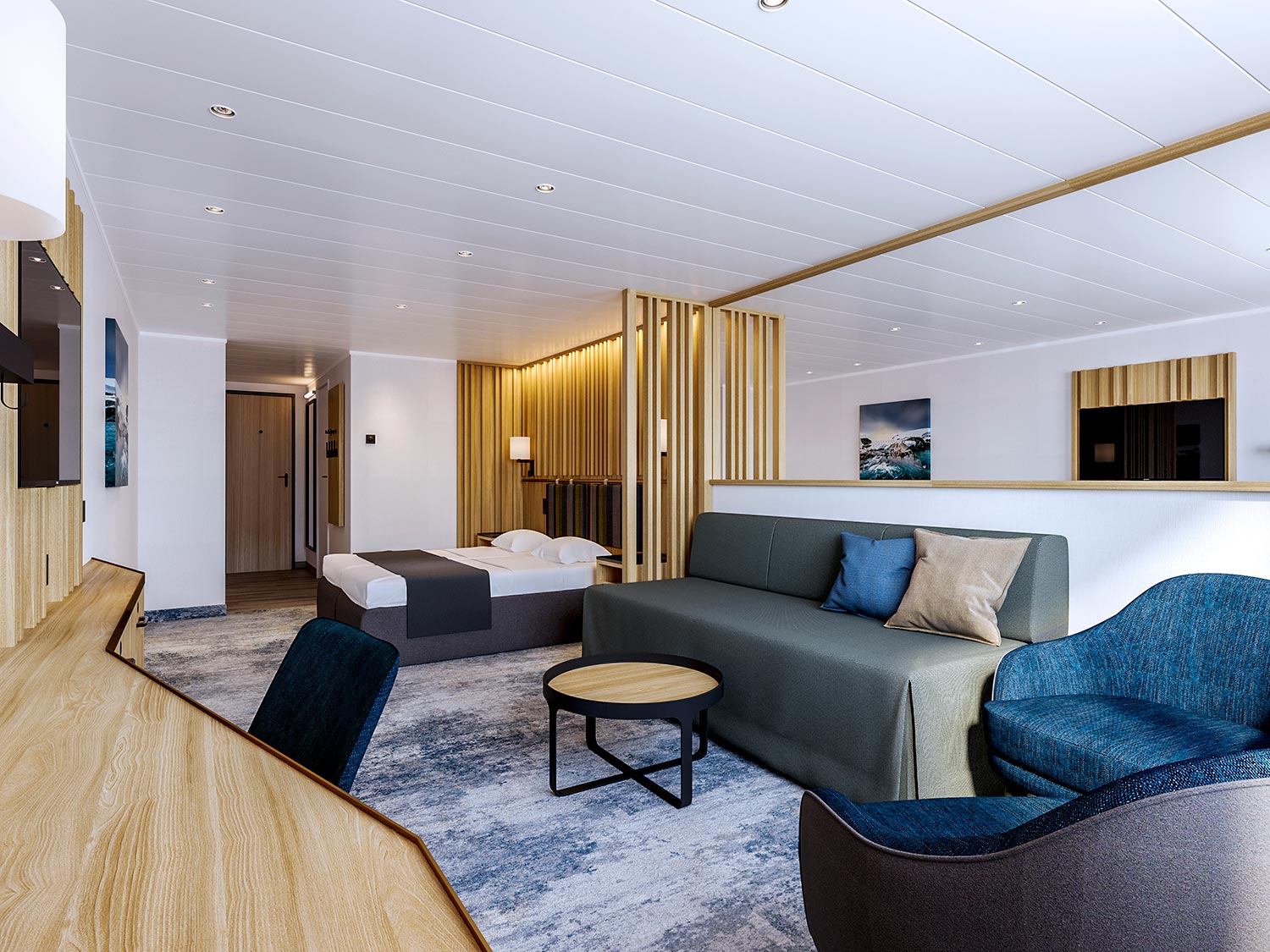 Wyposażenie : jedno podwójne lub dwa pojedyncze łóżka w prywatnej sypialni z garderobą, część wypoczynkowa z rozkładaną sofą i dodatkową garderobą w przedpokoju, prywatny balkon, biurko, lodówka, telewizor, prywatna łazienka z prysznicem, wanną i podgrzewaną podłogą oraz oddzielna toaleta.