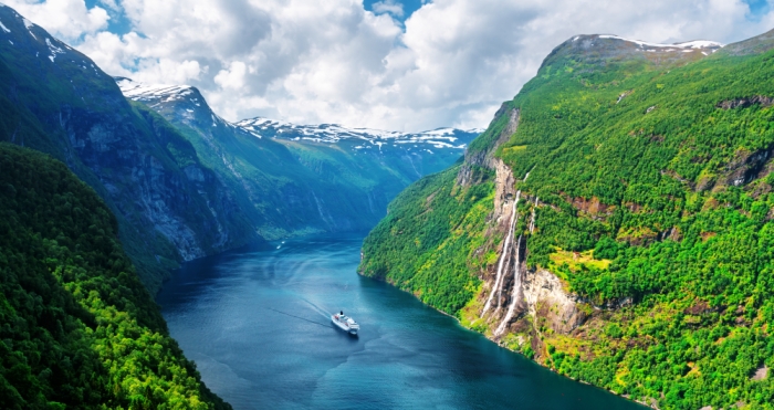 Zwiedzamy miejscowości Lom z typowym dla norweskiej architektury sakralnej drewnianym kościółkiem (Stavkirke). Następnie wyruszamy w drogę do Geiranger, miejscowości leżącej na początku Geirangerfjorden - najbardziej urokliwego fiordu Norwegii. Po drodze wjedziemy na szczyt Dalsnibby (1500 m n.p.m.), skąd rozpościera się widok na cały fiord. Dalej już z pokładu promu podziwiamy strome ściany Geirangerfjorden i piękny Wodospad Siedmiu Sióstr.